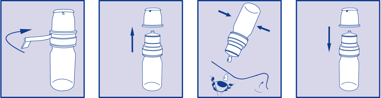 - Presione con los dedos a ambos lados de la botella para que se forme una gota. Aplíquela directamente sobre el ojo o añádala sobre la lente.